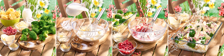 - 2/3 des Käses, Schmand, Milch, körnige Brühe, Pfeffer und Muskat verrühren. Die Nudeln abgießen und tropfnass zurück in den Topf geben. Käsesoße und Schinkenwürfel vorsichtig unterheben.